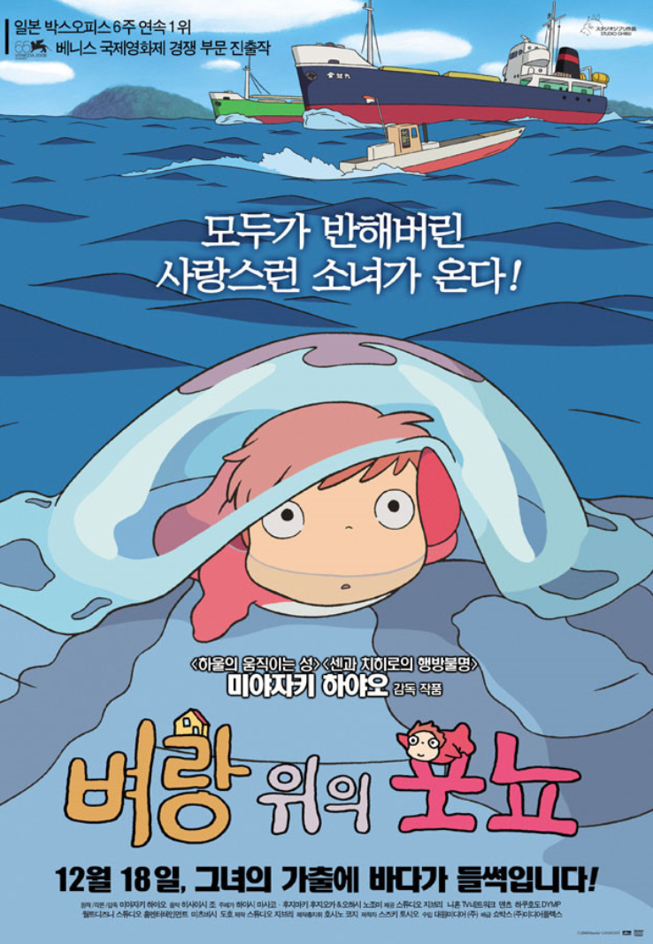 "벼랑 위의 포뇨"는 미야자키 하야오가 각본을 쓰고 감독하고 스튜디오 지브리가 제작한 2008년 일본 애니메이션 판타지 영화입니다. 이 이야기는 소스케라는 이름의 다섯 살 소년과 친구가 된 후 인간이 되기를 꿈꾸는 포뇨라는 이름의 금붕어를 중심으로 전개됩니다. 이 영화는 인간이 되고 싶은 포뇨의 소망이 자연의 불균형을 일으키면서 등장인물과 관객 모두를 바다와 생명 그 자체의 경이로움에 더 가깝게 만드는 모험으로 이어지기 때문에 우정, 사랑, 그리고 자연 세계라는 주제를 탐구합니다.